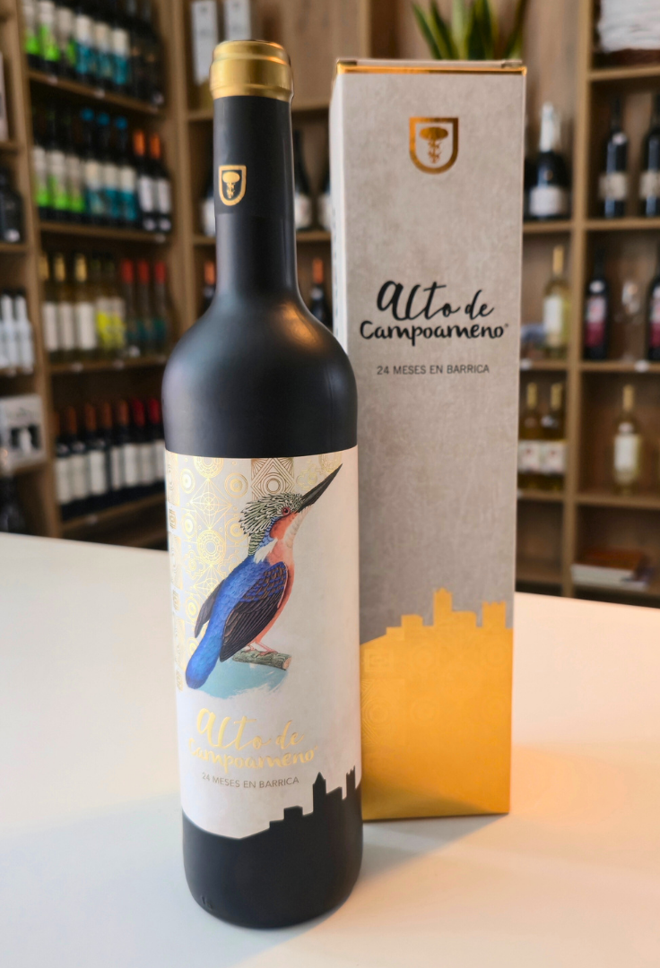 Alto de Campoameno es un vino reserva de gran presencia, con 24 meses en barrica de roble francés y americano. Presenta un color picota profundo con reflejos teja y una nariz compleja de fruta negra madura, notas balsámicas, chocolate, vainilla y especias. En boca es tánico, potente y con una acidez viva que prolonga el recorrido final. Un vino que exige atención y se regala al paladar momentos memorables. Elegancia en la copa, o como regalo.